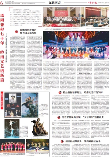 《中国艺术报》推出《风雨兼程七十年 岭南文艺谱新篇》,从“旗帜鲜明讲政治 勠力同心谋发展”“精品创作精彩纷呈 岭南文艺百花争妍”“德艺双馨风尚引领 ‘文艺粤军’蓬勃壮大”“新征程战鼓催人 攀高峰接续奋斗”四方面回顾广东省文联成立70周年来的工作。