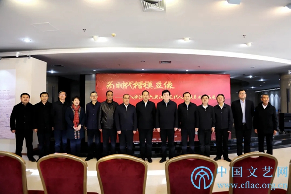 12月4日,为时代楷模立像——八步沙“六老汉”三代人专题美术作品展(北京展)在京开幕。图为与会领导嘉宾合影。
