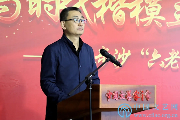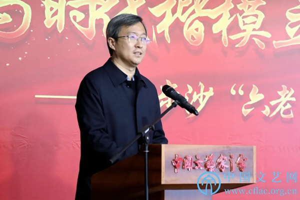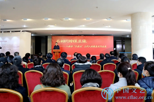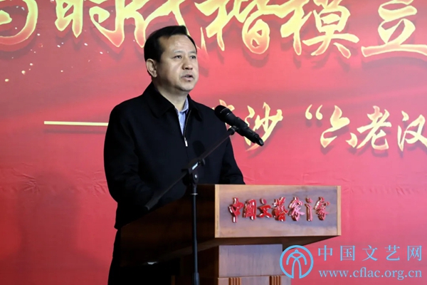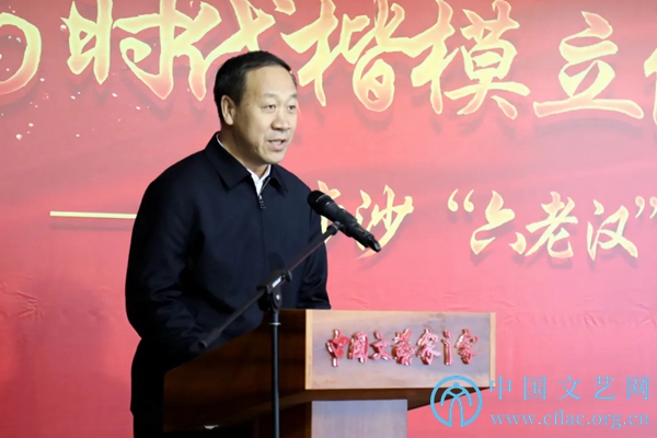 12月4日,为时代楷模立像——八步沙“六老汉”三代人专题美术作品展(北京展)在京开幕。图为中国美协分党组成员、秘书长马锋辉在开幕式上致辞。