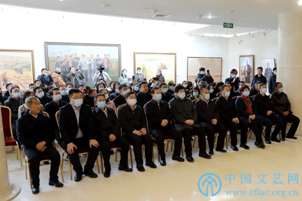 12月4日,为时代楷模立像——八步沙“六老汉”三代人专题美术作品展(北京展)在京开幕。图为出席开幕式的领导嘉宾。