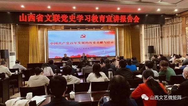 山西省文联召开党史学习教育宣讲报告会。报告会以《中国共产党百年发展的历史贡献与启示》为题,讲解了中国共产党百年奋斗的光辉历程和历史性贡献,中国共产党百年历史发展的重要启示,在全党开展党史学习教育的重要意义。