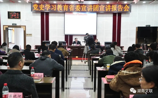 湖南省文联举行党史学习教育省委宣讲团宣讲报告会。报告会以《胸怀千秋伟业 恰是百年风华——中国共产党的使命担当和奋斗历程》为题,从把握“三个天”的光辉历程、把握“三个为”的初心使命、把握“三个路”的道路选择和把握“三个色”的文化优势等4个方面展开。