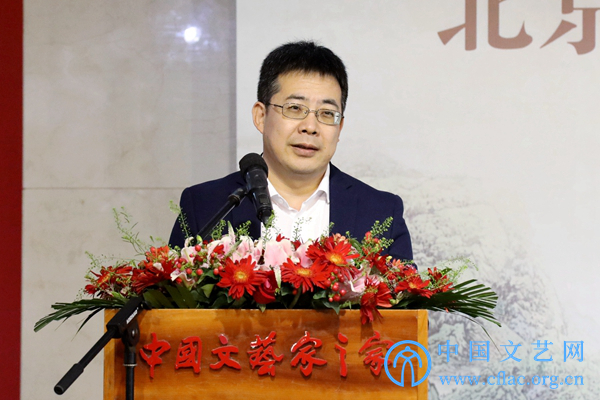 10月12日,北京城市山水画研究会名家作品邀请展暨杨留义城市山水画师生作品展在京举办。图为半岛游戏官方登录副总编辑余宁在开幕式上致辞。 中国文艺网 高森 摄