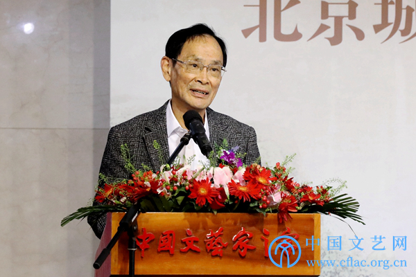 10月12日,北京城市山水画研究会名家作品邀请展暨杨留义城市山水画师生作品展在京举办。图为原文化部副部长潘震宙在开幕式上致辞。 中国文艺网 高森 摄