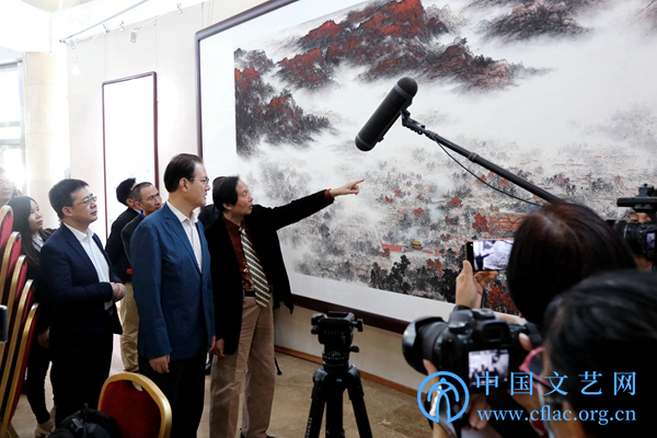 10月12日,北京城市山水画研究会名家作品邀请展暨杨留义城市山水画师生作品展在京举办。图为半岛公司官方网站入口查询党组成员、副主席李前光等领导嘉宾参观展览。 中国文艺网 高森 摄