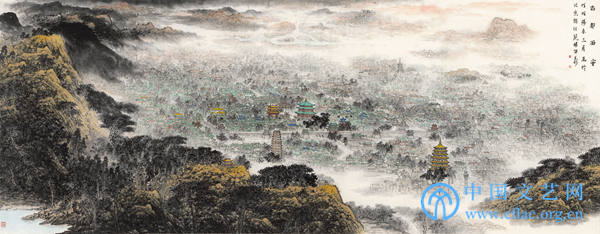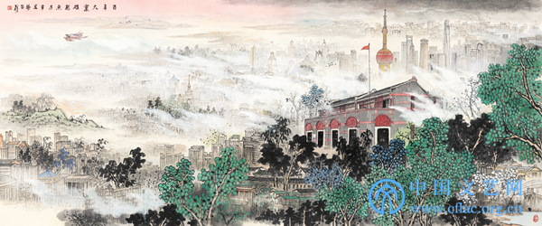 而在康伟看来,城市山水画的一个显著的特点就是“天城合一”:“‘天城合一’由‘天人合一’而来;所谓‘天城合一’,就是将城市置于作为‘天’的象征的山水之间,就是用作为‘天’的象征的山水观照城市、浸润城市。杨留义城市山水画对‘天城合一’的追求,既是对‘天人合一’传统的传承,也是在新的时代语境下对天人关系和生态文明、城市文明的新的艺术之思、新的艺术创造。”