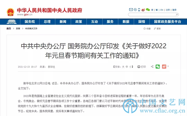 中共中央办公厅 国务院办公厅印发《关于做好2022年元旦春节期间有关工作的通知》
