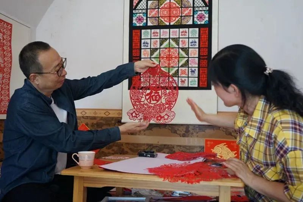 潘鲁生与陕北剪纸艺人董林美在讨论剪纸创作