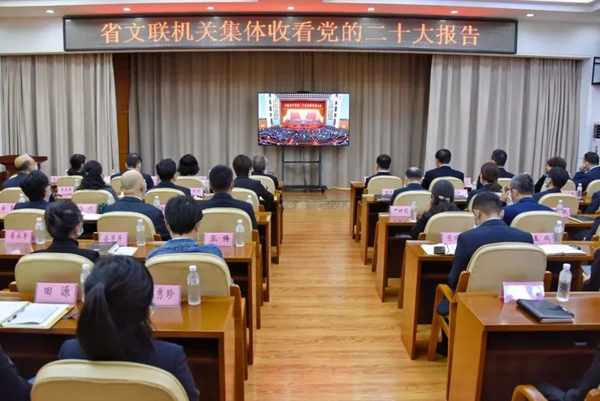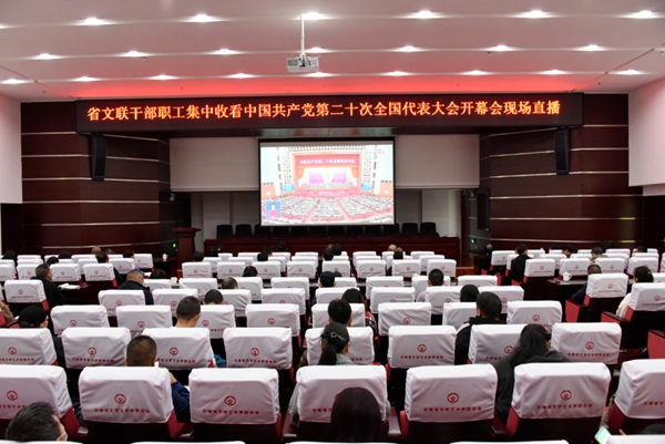 贵州省文联组织机关党员干部集中收看党的二十大开幕会盛况,聆听习近平总书记代表第十九届中央委员会向大会作的报告。大家一致表示,要把学习贯彻党的二十大精神作为当前和今后一个时期的首要政治任务抓紧抓实,进一步增强思想自觉和行动自觉,持续坚持以人民为中心的创作导向,推动中华优秀传统文化创造性转化、创新性发展,推出更多增强人民精神力量的优秀作品,为奋力谱写多彩贵州现代化建设新篇章贡献文艺力量。