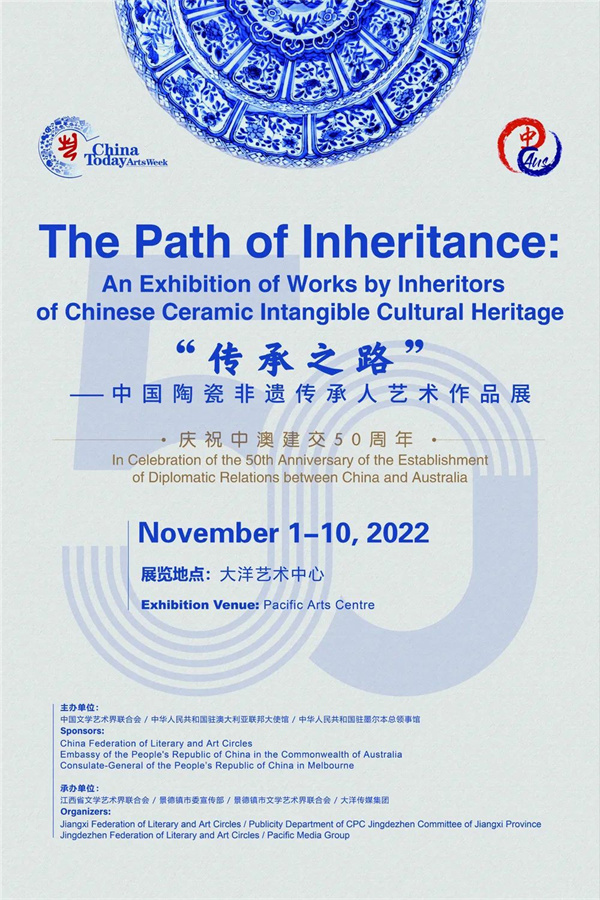 为庆祝中澳建交50周年,2022“今日中国”艺术周于11月3日在澳大利亚墨尔本大洋艺术中心开幕。艺术周(墨尔本站)由中国文学艺术界联合会、中国驻澳大利亚大使馆、中国驻墨尔本总领事馆联合主办,江西省文学艺术界联合会、景德镇市委宣传部、景德镇市文学艺术界联合会、黑龙江文学艺术界联合会、黑龙江省美术家协会、大洋传媒集团承办。