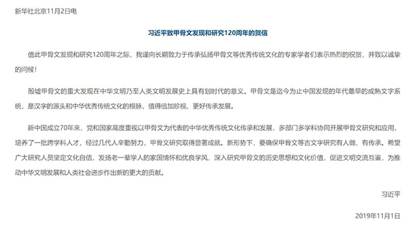 2019年,习近平总书记致信祝贺甲骨文发现和研究120周年时强调,甲骨文是迄今为止中国发现的年代最早的成熟文字系统,是汉字的源头和中华优秀传统文化的根脉,值得倍加珍视、更好传承发展。