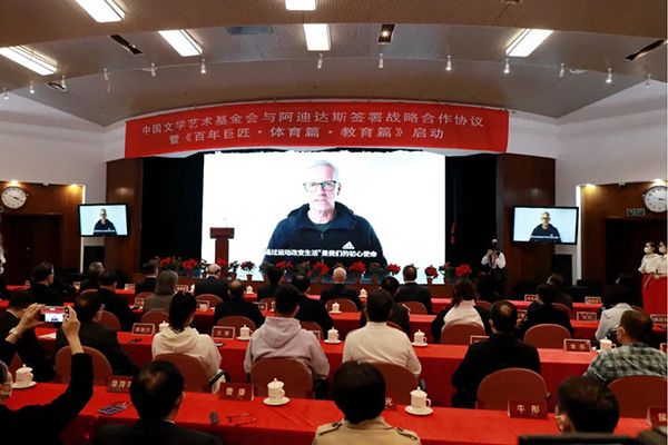 值中德建交50周年之际,11月5日,中国文学艺术基金会与阿迪达斯体育(中国)有限公司签署战略合作协议暨《百年巨匠·体育篇·教育篇》启动仪式在北京中国文艺家之家隆重举行。双方正式开启为期三年的战略合作,通过完成大型系列电视纪录片《百年巨匠》和系列文化公益活动,共同讲述中国故事,推动中华文化更好走向世界。