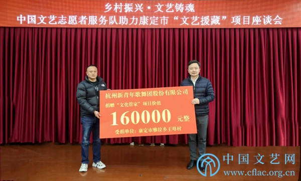 杭州市文艺两新发展促进会会长、杭州新青年歌舞团股份有限公司董事长张钎向康定市雅拉乡王母村捐赠“文化管家”服务项目,雅拉乡党委书记余翔接受捐赠。