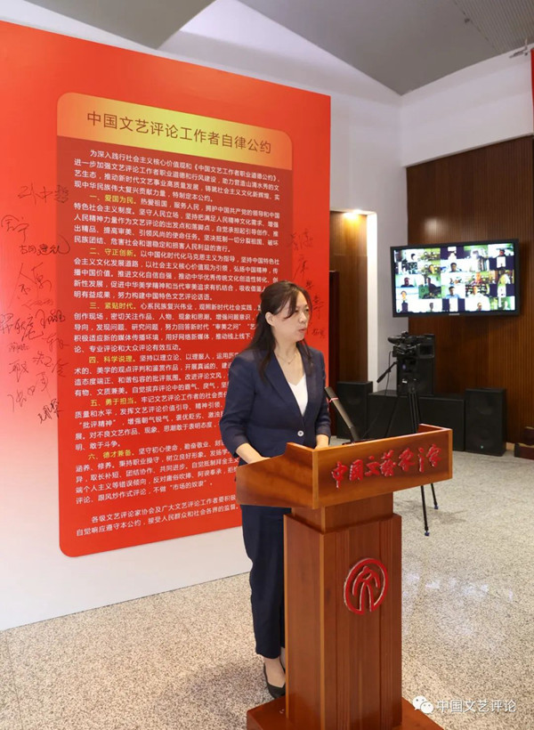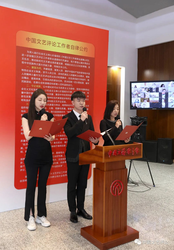 中国舞台美术学会编辑部总编赵妍、北京奇幻森林魔术文化产业集团有限公司策划张东帅、央广总台中国电视剧制作中心编剧王晓玉作为新会员代表一起庄严宣读了《中国文艺评论工作者自律公约》。