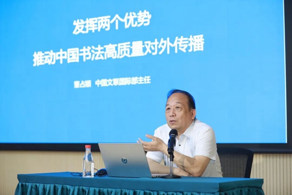 董占顺作《发挥两个优势 推动中国书法高质量对外传播》的讲座,他从“中国书法对外传播的意义”“当代中国书法海外传播的途径及效果评估”“关于加强中国书法海外传播的思考”几方面分享了对书法海外传播的心得感受。他认为中国书法对外传播具有政治意义、美学意义、教育意义、文化意义和国际意义,要积极推动中华文化走出去,扩大中华文化影响力,增进中外文明交流互鉴,共享中华文明成果。