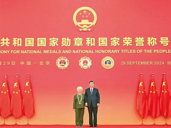 2024年9月29日,中华人民共和国国家勋章和国家荣誉称号颁授仪式在北京人民大会堂金色大厅隆重举行。中共中央总书记、国家主席、中央军委主席习近平向“人民艺术家”国家荣誉称号获得者田华颁授奖章。 新华社记者 谢环驰/摄