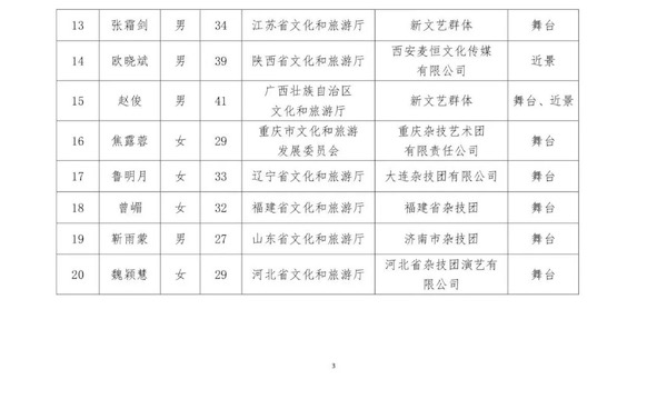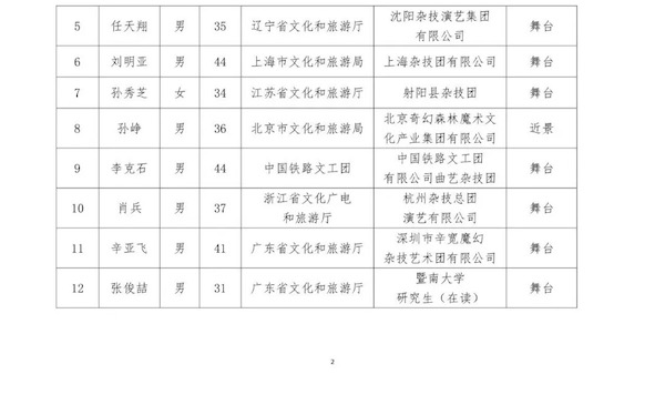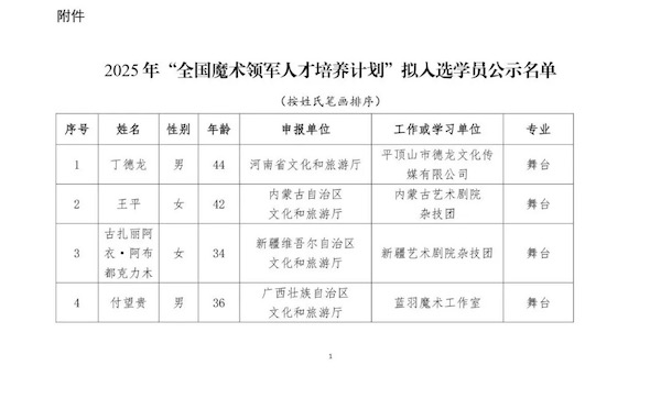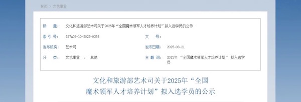3月21日,文化和旅游部艺术司公示2025年“全国魔术领军人才培养计划”拟入选学员名单,共20人拟入选。