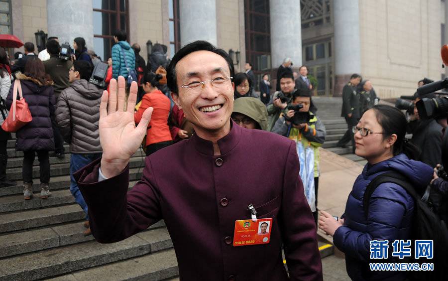3月12日, 全国政协十二届一次会议在人民大会堂举行闭幕会。图为大会结束后,全国政协委员巩汉林离开会场时向记者挥手告别。
