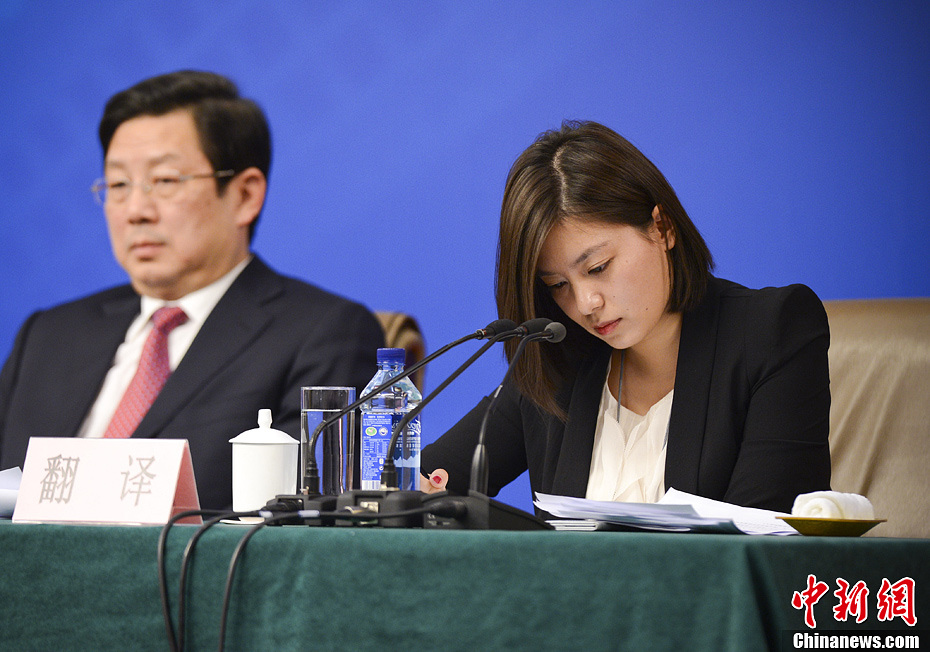 3月14日,十二届全国人大一次会议新闻中举行记者会,身穿黑色职业装,留齐肩长发,神情专注的女翻译,因表情冷艳,吸引了现场不少目光。中新社发 刘震 摄