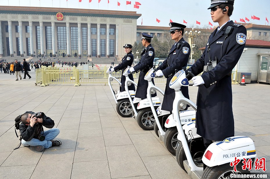 3月14日上午,十二届全国人大一次会议在北京人民大会堂举行第四次全体会议。一名摄影师席地坐下拍摄执勤警察。中新社发 刘占昆 摄