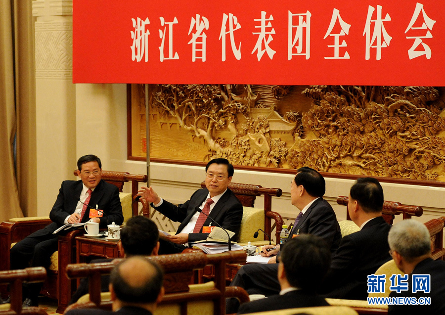 3月5日,中共中央政治局常委、国务院副总理张德江参加十二届全国人大一次会议浙江代表团的审议。 新华社记者 刘建生 摄