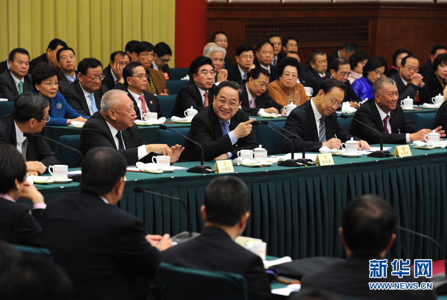 3月6日,中共中央政治局常委、全国政协十二届一次会议主席团会议主持人俞正声参加全国政协十二届一次会议港澳地区全国政协委员联组会。新华社记者 饶爱民 摄