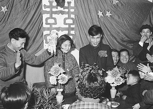 春节是结婚的好日子。这是1957年春节,辽宁省沈阳风动工具厂的工人鞠复海(新郎)和俞凤仙(新娘)在婚礼仪式上接受朋友们的祝贺。