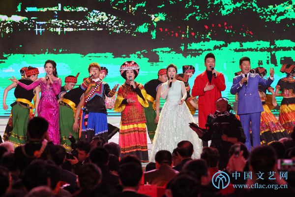 1月20日,“百花迎春——中国文学艺术界春节大联欢”在北京国家会议中心举行。图为邓玉华、阿木、乔军、汤非、严当当、伊丽媛演唱《彝族歌曲》 中国文艺网 高晴 摄