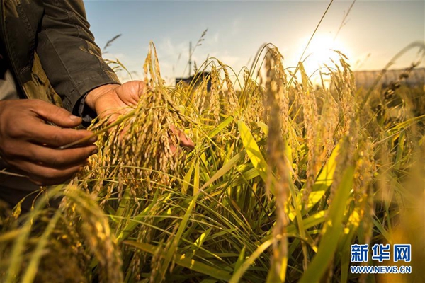 在吉林省舒兰市平安镇,农民在稻田间观察稻穗灌浆情况(2018年9月18日摄)。新华社记者 许畅 摄