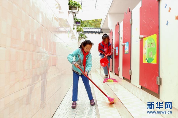 两名学生在贵州省织金县熊家场镇小学的厕所打扫卫生(2018年10月23日摄)。新华社记者 张玉薇 摄
