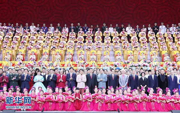 9月29日,庆祝中华人民共和国成立70周年大型文艺晚会《奋斗吧 中华儿女》在北京人民大会堂举行。习近平、李克强、栗战书、汪洋、王沪宁、赵乐际、韩正、王岐山等党和国家领导人同4000多名观众一起观看演出。演出结束后,习近平等走上舞台同演职人员合影留念。新华社记者王晔摄