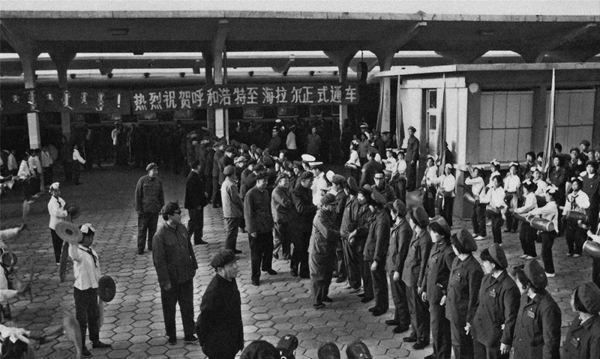1980年5月1日,自治区首府各族群众欢庆呼和浩特至海拉尔旅客快车正式通车(岑培康摄)
