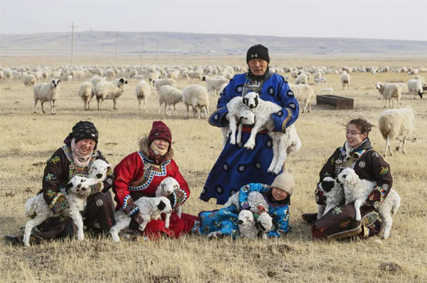 锡林郭勒盟牧民道·斯琴巴特接春羔后与家人合影。锡盟通过扶持、服务等有效措施,引导牧民转变生产经营方式,鼓励早接羔早出栏,减轻草场压力,走生态优先、绿色发展的畜牧业高质量发展之路(白嘎利摄)