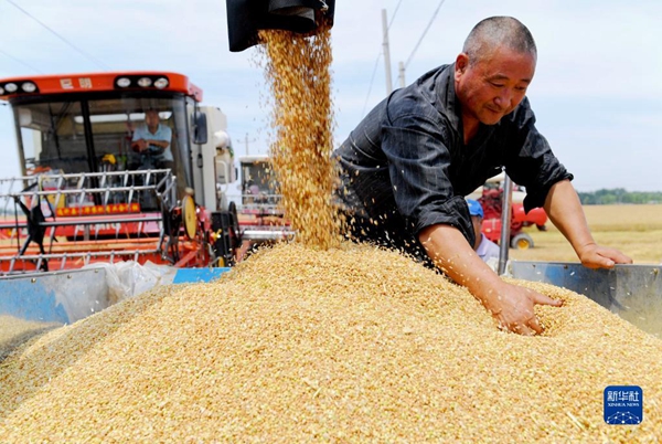 河北省衡水市阜城县崔家庙镇前砖门村农民在麦田收获小麦(2021年6月13日摄)。新华社记者 朱旭东 摄