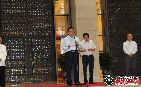 2017年9月17日,由文化部、国家文物局主办,中国国家博物馆、中国文物交流中心承办的“秦汉文明”展在国家博物馆开幕。图为文化部部长雒树刚讲话并宣布展览开幕。