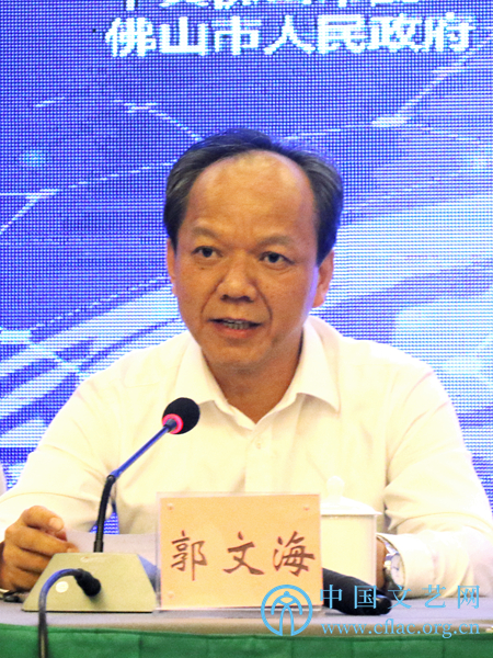 8月9日,第27届中国金鸡百花电影节暨第34届大众电影百花奖新闻发布会在京举行。图为佛山市委常委、宣传部部长、顺德区委书记郭文海通报本届电影节筹备工作情况。中国文艺网 韩雪竹 摄
