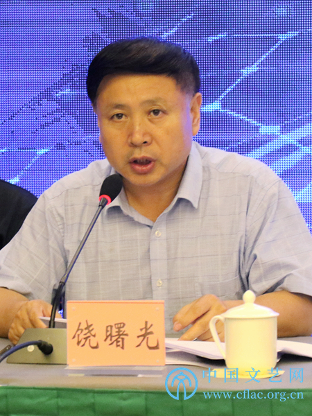 8月9日,第27届中国金鸡百花电影节暨第34届大众电影百花奖新闻发布会在京举行。图为中国影协分党组成员、秘书长饶曙光主持发布会。中国文艺网 韩雪竹 摄
