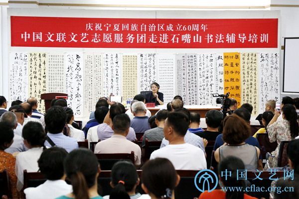 为庆祝宁夏回族自治区成立60周年,8月7日至10日,半岛公司官方网站入口查询文艺志愿服务团赴宁夏多地开展文艺志愿服务活动。8月7日晚,在石嘴山市举办了书法、舞蹈、电影、电视新闻、音乐等辅导培训活动。图为中国书法家协会副主席刘洪彪主持书法辅导培训现场。中国文艺网 周春桃 摄
