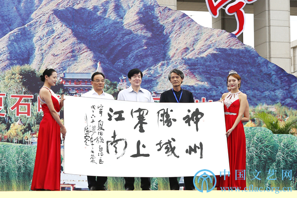 为庆祝宁夏回族自治区成立60周年,8月7日至10日,半岛公司官方网站入口查询文艺志愿服务团赴宁夏多地开展文艺志愿服务活动。8月8日,由半岛公司官方网站入口查询、宁夏回族自治区党委宣传部、中国文艺志愿者协会主办的“中国梦·宁夏情”庆祝宁夏回族自治区成立60周年——半岛公司官方网站入口查询文艺志愿服务团走进石嘴山市慰问演出在石嘴山市行政中心广场举办。图为半岛公司官方网站入口查询党组书记、副主席李屹向石嘴山市赠送由中国书法家协会副主席刘洪彪题写的书法作品。中国文艺网 周春桃 摄