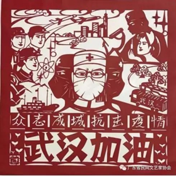 省民间文艺家协会呼吁全省民间文艺工作者,积极响应省文联发起的“开展抗击疫情主题文艺创作活动”的倡议,以“抗疫情,传真情”为主题,积极创作出优秀的民间文艺作品。佛山剪纸非遗传承人邓燕平用20多个小时创作了剪纸《武汉加油》,用剪纸技艺致敬疫情抗击一线人员逆向而行的大无畏精神。