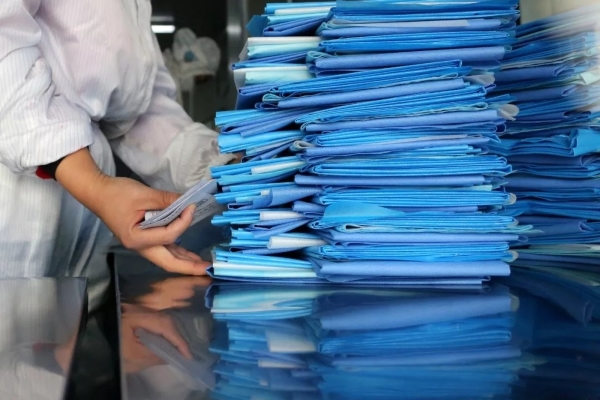1月30日,在山东省枣庄市市中区一家专业生产医护用品的企业生产车间,工人在严格消毒环境下生产医护产品。孙中喆 摄