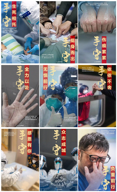 由人民日报新媒体刊发的一组摄影作品《一线抗疫人员的手》,让人震撼和泪目。这组摄影作品由9幅以医务人员的“手”为主题的图片组成,每一张图片都是一个动人的故事。《生死相托》讲护士长马晶握住因害怕而流泪的一位老年患者的手安慰她:“可以治愈的,我们一直都陪着你”;《挺身而出》讲石家庄第九八〇医院白求恩医疗队60余名队员写下请战书,要求奔赴武汉抗疫一线;《伤痕累累》讲22岁感染科护士胡佩英因长期受消毒液和酒精浸泡而被侵蚀得伤痕累累的手;《全力以赴》讲28岁的王涛下夜班后脱下防护服和口罩,露出被汗水浸得皱巴巴的手;《无惧前行》讲海军军医大学医疗队重症监护室医护人员在工作间歇竖起拇指为自己鼓劲打气;《依依不舍》讲上海奉贤区中心医院吴玲在大年初三与丈夫依依挥别走向抗“疫”前线;《感恩有你》讲一位小患者举起小手给武汉同济医院儿科急诊临床护士鲍翠芳比了一个大大的心;《众志成城》讲武汉协和医院的医生们紧握彼此的手互相加油鼓劲;《负重前行》讲武汉肺科医院ICU主任胡明得知同行好友感染病危而泣不成声,用手抹干眼泪后继续救治病人。这组摄影作品无声却感人,“于细微处见真情”,正是这样一双双普通而平凡的手为全国人民筑起抗击疫情的钢铁长城。摄影人有情怀,作品才有力量。