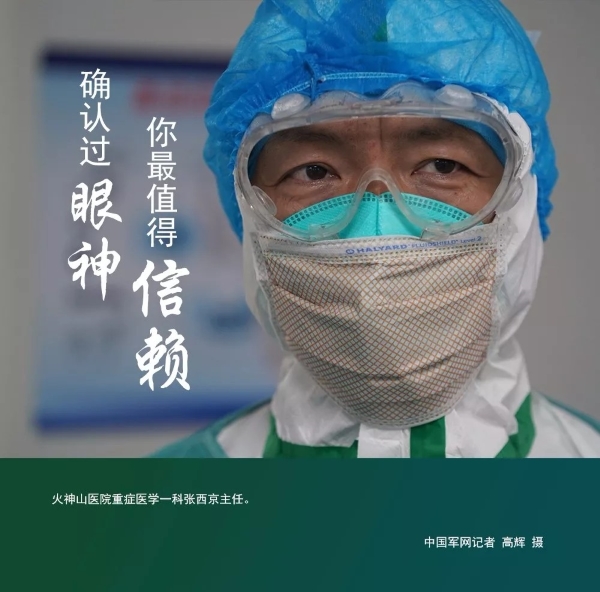 中国军网记者高辉在火神山医院重症医学一科拍摄时,感慨地说:“没有穿上防护,体会不到医护人员们的感受,也没有办法拍出好作品,只有感同身受,才知道穿上那么难受,才知道患者除了用药最需要什么,最后我发现了眼睛,因为声音拍不出来,所以我选择眼睛,抓拍眼神。”于是,就有了一组关于医护人员“眼神”的特写,“用影像帮患者们记住他们的眼睛,让所有人记住那一双双坚毅的眼神!”每一位医护人员,都值得我们行注目礼。确认过眼神,他们是患者最信赖的人!