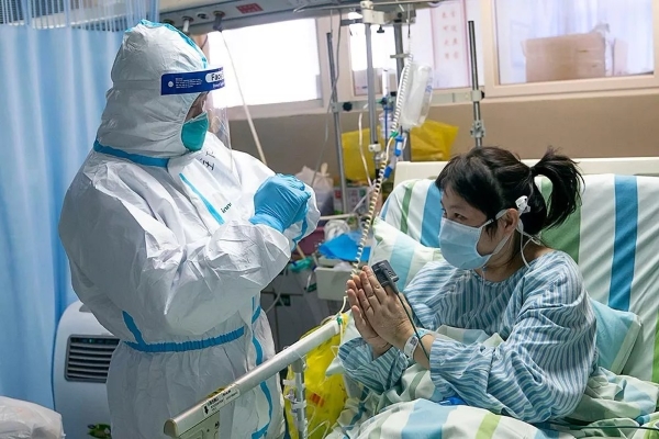 1月24日,除夕时节,武汉大学中南医院重症隔离病房,患者黄淑丽在经过十余天的治疗后,已经退烧,重症医学科主任彭志勇与她交谈时,笑着给她拜了个年,她也双手合十回礼。熊琦 摄