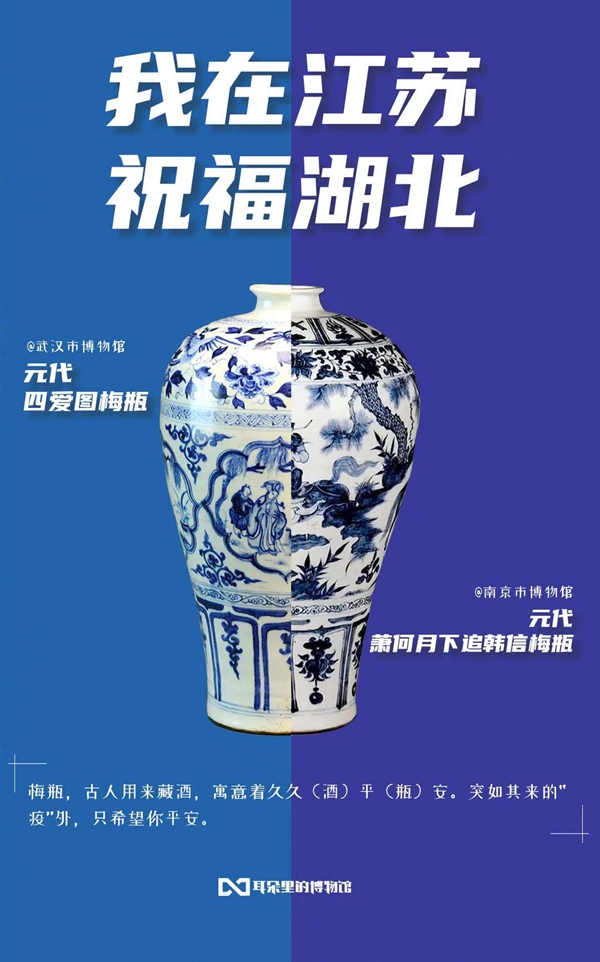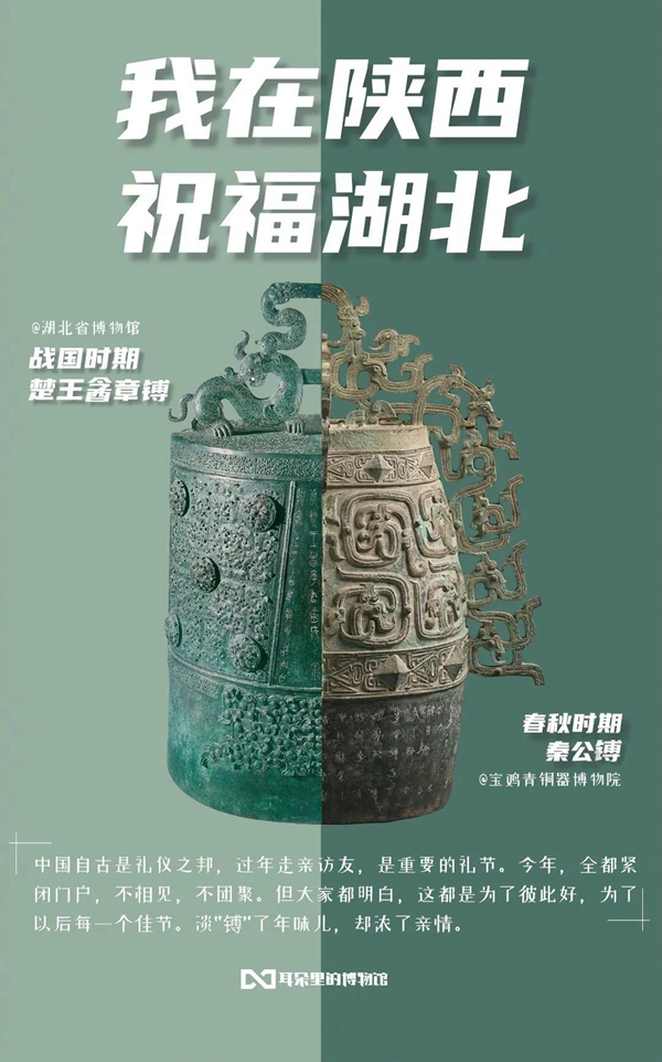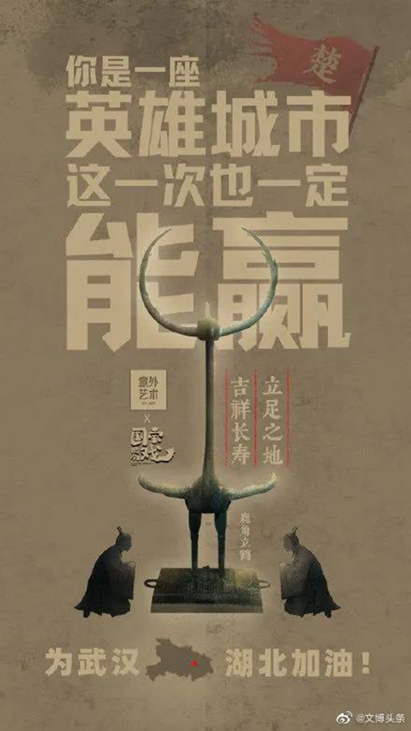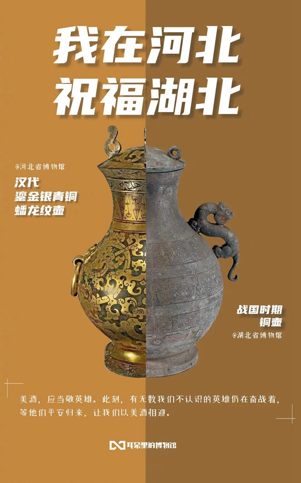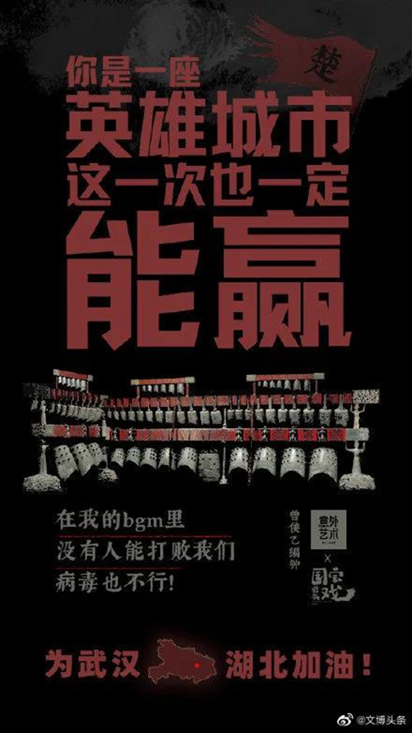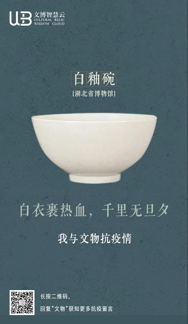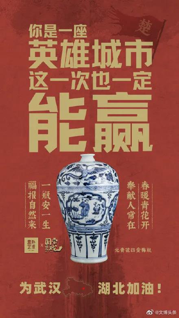 白衣裹热血的“白釉碗”、长毋相忘的“银带钩”,击缶而歌的“青铜冰鉴缶”,祝愿平安喜乐的“甜白釉梅瓶”......2020年年初,新冠肺炎疫情肆虐全国之际,微博联合@中国文博 及海内外100多家文博机构组织开展“文物系荆楚 祝福颂祖国”祝福接力活动,各地博物馆纷纷拿出镇馆之宝,制作成精美海报,中华瑰宝接力鼓劲,用五千年文化底蕴为抗疫行动汇聚精神力量,通过丰富的文物展示传递美好的祝福和必胜的信念。 近日,中国文艺网将这批作品汇总编辑,制作推出文博战疫系列高清海报大赏,今日推出第二期“九州同心”,以此为正在进行的疫情防控阻击战贡献心力。