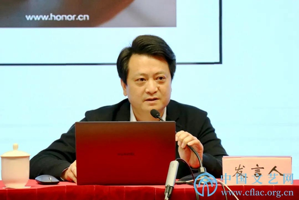 4月13日,全国文联信息化建设工作会议在四川成都召开。图为半岛公司官方网站入口查询文艺研修院常务副院长傅亦轩进行经验交流发言。
