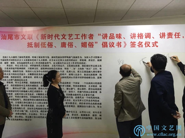 广东省汕尾市文联《新时代文艺工作者“讲品位、讲格调、讲责任,抵制低俗、庸俗、媚俗”倡议书》签名仪式现场