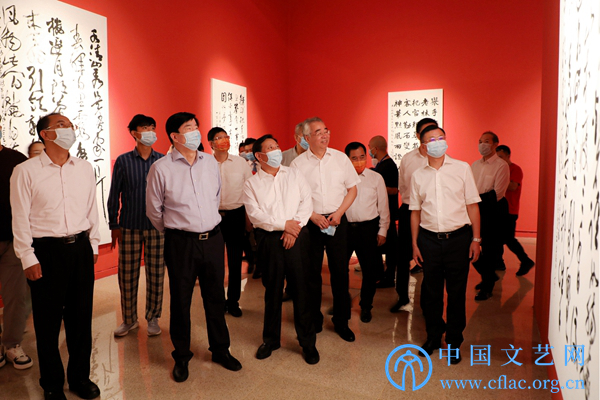 9月3日上午,“江山壮丽 人民豪迈”湖南省主题书法展在国家博物馆开幕。图为领导嘉宾参观展览。 中国文艺网 高森 摄