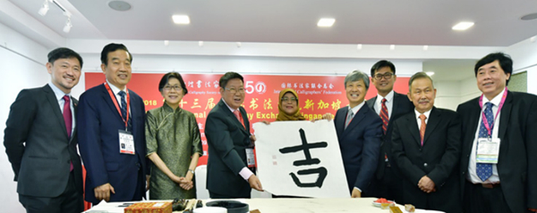 2018年9月,第13届国际书法交流大展在新加坡举办。图为新加坡总统哈莉玛(左五)为雅集开笔。