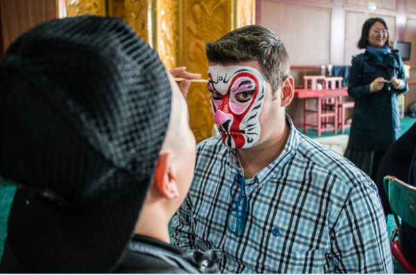2016年10月,中东欧 16个国家的国际戏剧节艺术总监访华,出席在上海举办的“多元共享文化艺术新活力——‘一带一路’文化艺术论坛” 。图为国际友人体验中国戏曲化妆(左)。